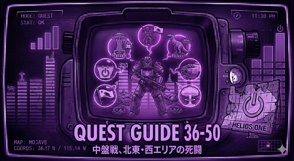 | 48 | All or Nothing | ラッキー38 / Mr.ハウス | ハウスルート最終クエスト。モハビの支配権を確立。 |